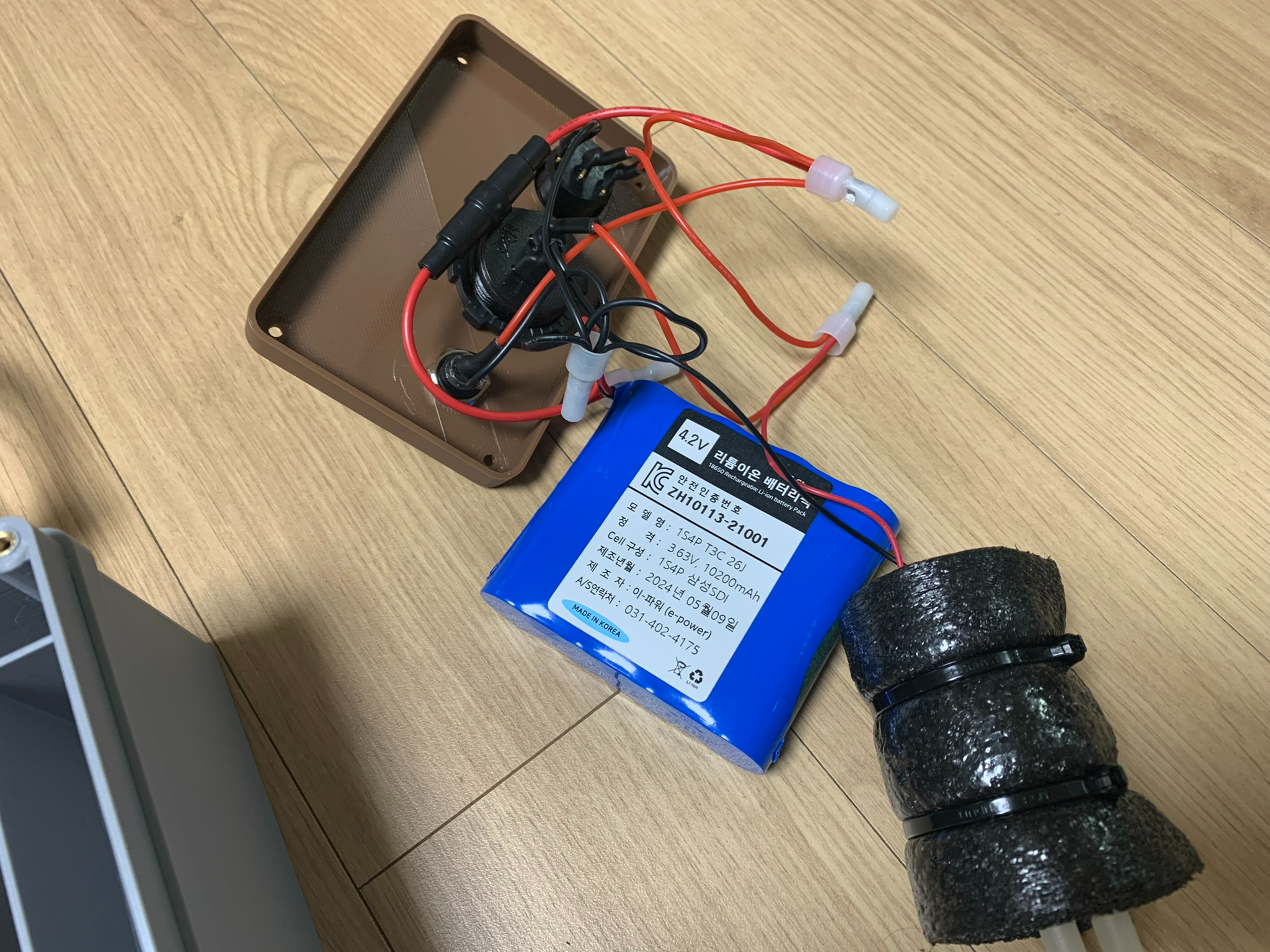 양수 높이가 2m이면 카약에서 물을 끌어오기에 이미 차고 넘치기 때문에 이걸로 테스트를 했는데, 2가지 문제가 나왔습니다. 첫 번째는 충전이 잘 안 되는 것이었고, 두 번째는 지속시간이 2시간인 것이었습니다.